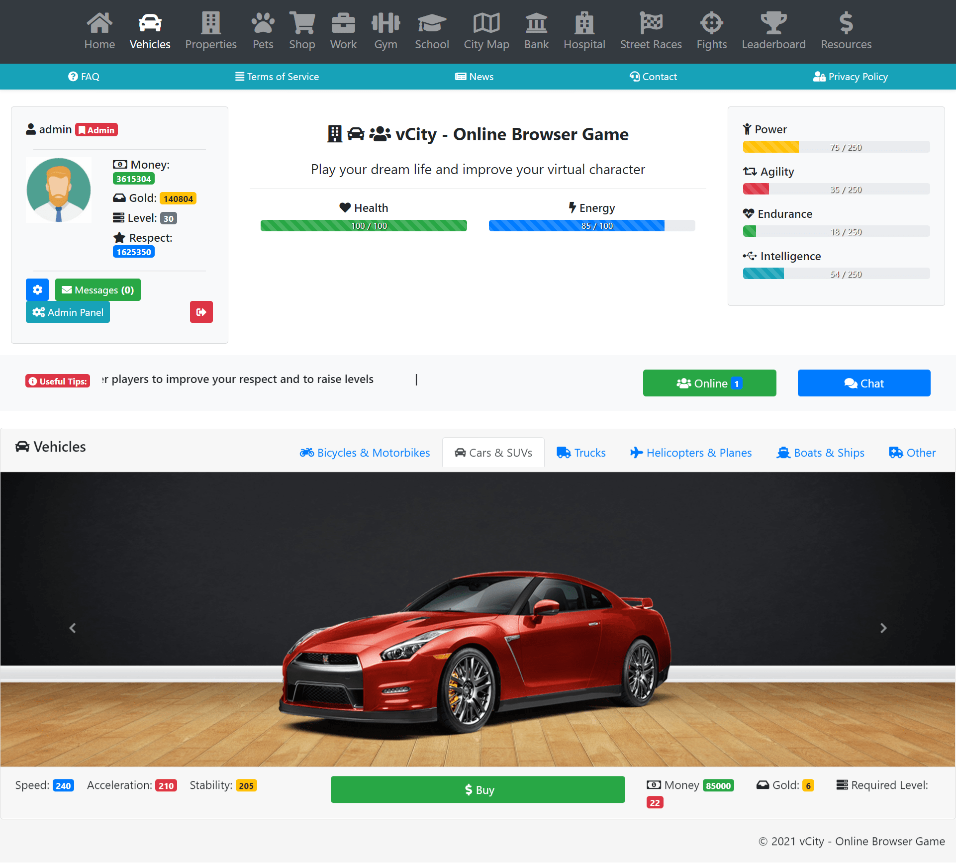vCity is an online browser game in which you can have your own virutal life. You can buy vehicles, items, properties and you can do many activities.