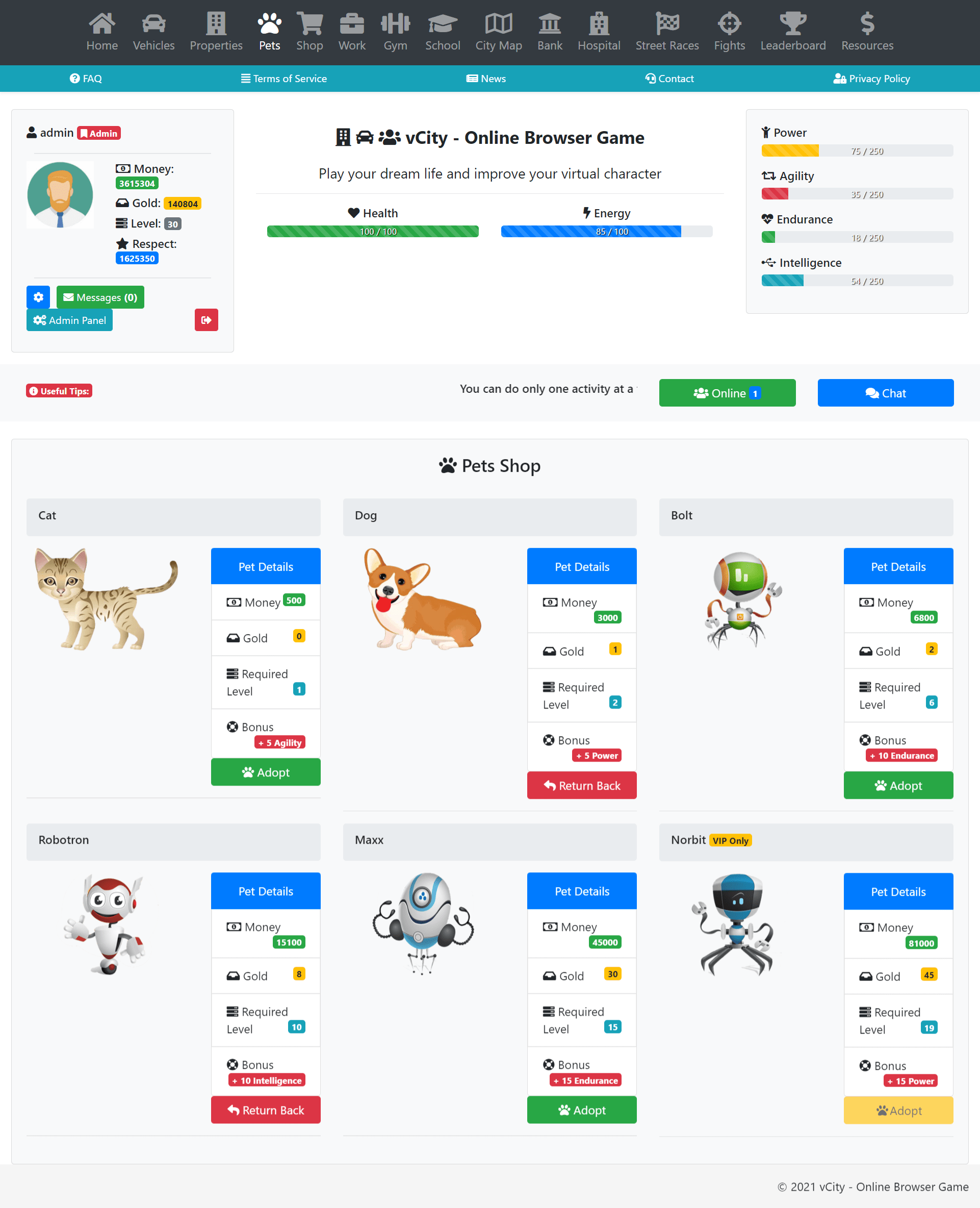 vCity is an online browser game in which you can have your own virutal life. You can buy vehicles, items, properties and you can do many activities.